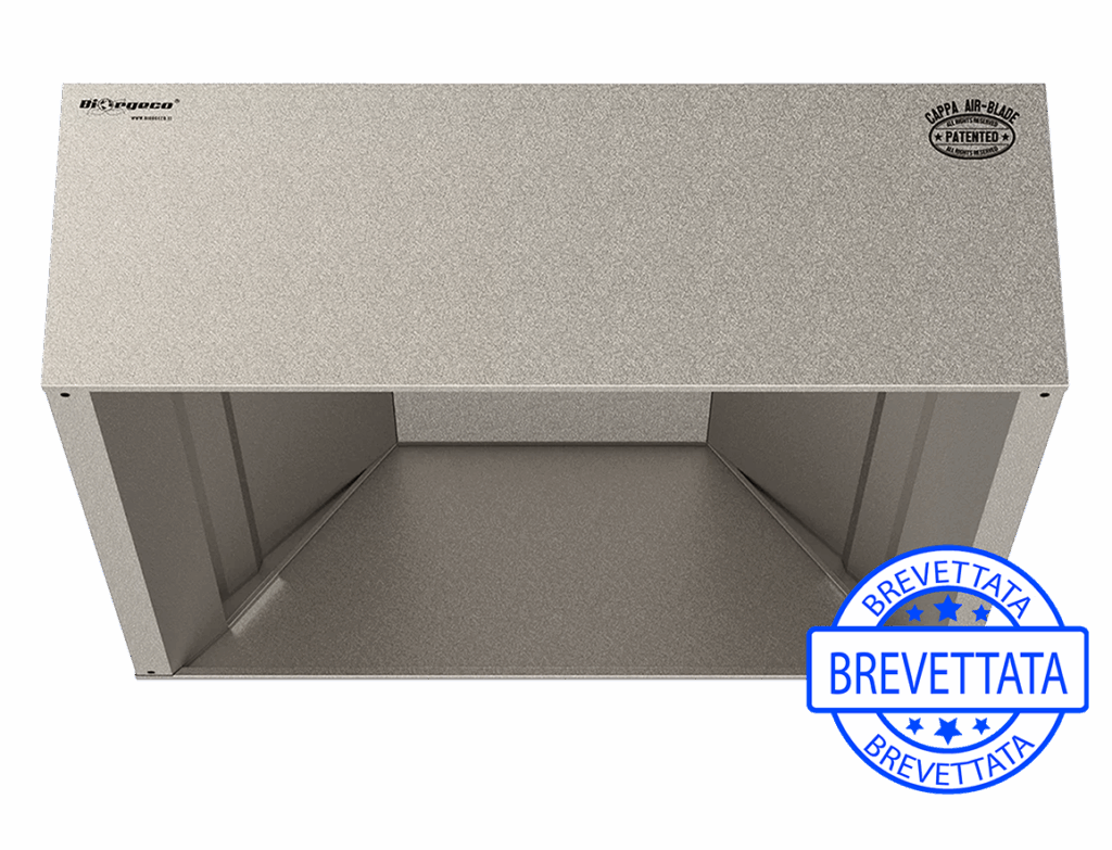 Cappa con aspirazione a lama d’aria, progettata per eliminare vapori, odori e fumi.