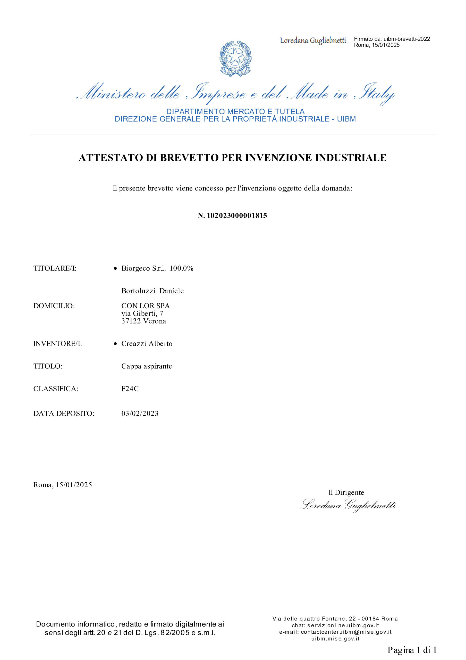 Brevetto per invenzione industriale n. 102023000001815 – depositato il 03/02/2023, concesso il 15/01/2025 (classifica F24C) dal Ministero delle Imprese e del Made in Italy – UIBM.